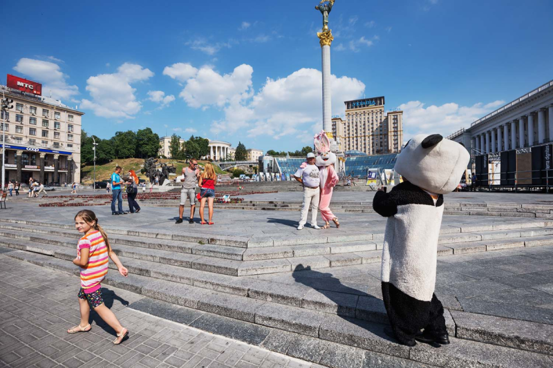 WAAROM? Maidan. Het Onafhankelijkheidsplein. Op het T-shirt staat ‘From Kiev with Love’. De Oekraïners hebben zich eerst afgescheiden van de Sovjet-Unie en vervolgens met succes de pro-Russische regering bestreden. Nu is alles weer normaal in Kiev, of zo lijkt het tenminste. Maar niet aan de grens met Rusland. De panda maakt een foto van de bunny (met een mooi meisje erin!).